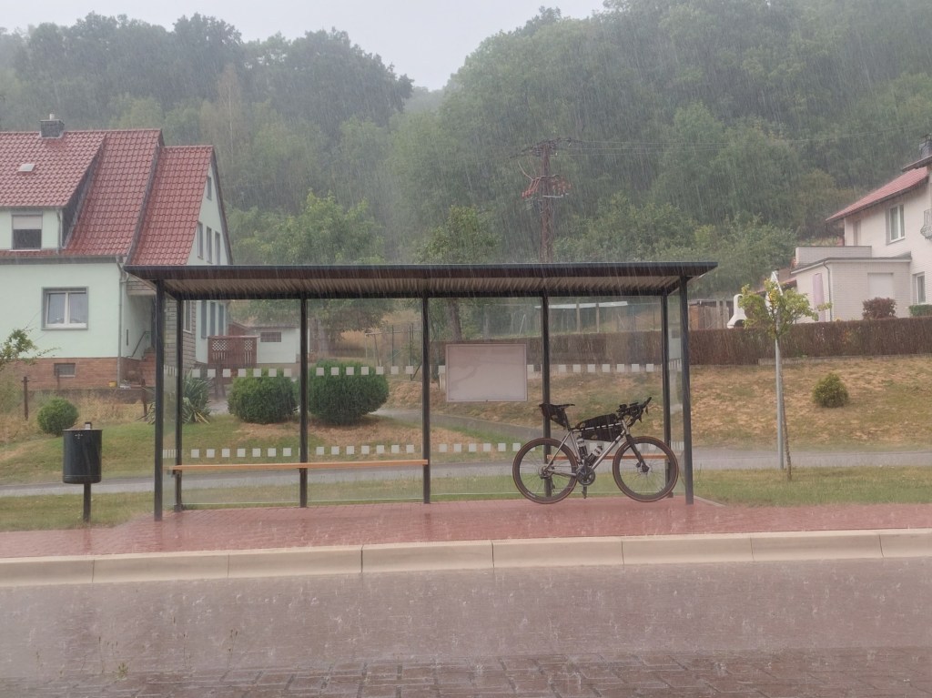 Lower Saxony was beautiful. I took a lot of small local roads, where I probably did some more climbing than the others, but the traffic was nearly none, which I enjoyed after a morning busy time around Dortmund and Dusseldorf. The heat did strike hard after midday. It was my bet to not take care of water in that area, and I paid for it feeling super tired and dehydrated in the afternoon. When I got to Gottingen, the weather changed, but I was already a little broken there and had to stop for a short break at McDonald’s. I was pretty lucky anyway, as, by the time when I was enjoying ice and milkshakes, the huge storm passed by with hail, tuner, and lightning. The same fast as it came it disappeared, but from that moment I had to be extra careful because I could see thunderclouds all around the horizon. I had three more storms above me that evening. Each time had to stop and wait for it to clear because the lightning was real, and I didn’t want it to get me while I’m on my steel bike. It was frustrating but when I looked around from the Ohm hills that I was crossing there, I could see the little stormy clouds everywhere around and I was sure, that this thing didn’t happen to me only, but also to lots of other riders.