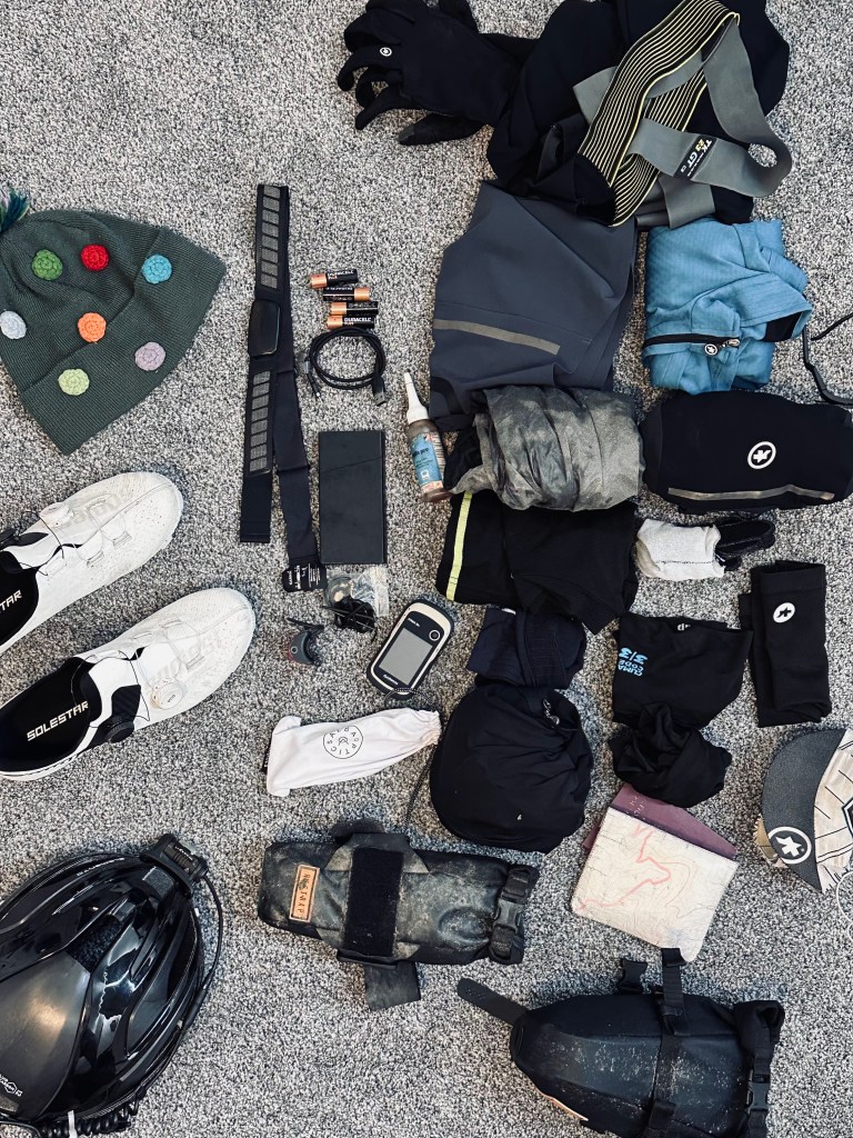 - Assos Gravel jacket (carried on the bar tube during the day)